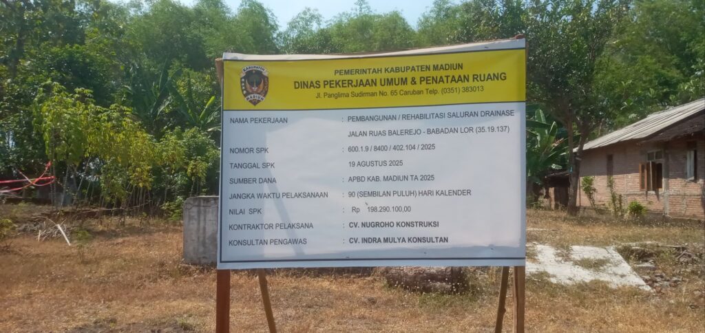Madiun, pilarpos.info – Pemerintah Kabupaten Madiun terus kebut pembangunan di berbagai sektor. Salah satu nya pembangunan drainase di ruas Balerejo – Babadan Lor Balerejo melalui DPUPR Bidang Bina Marga. Pembangunan tersebut berasal dari anggaran APBD Kab. Madiun tahun anggaran 2025 dengan nilai Rp. 198.290.100.