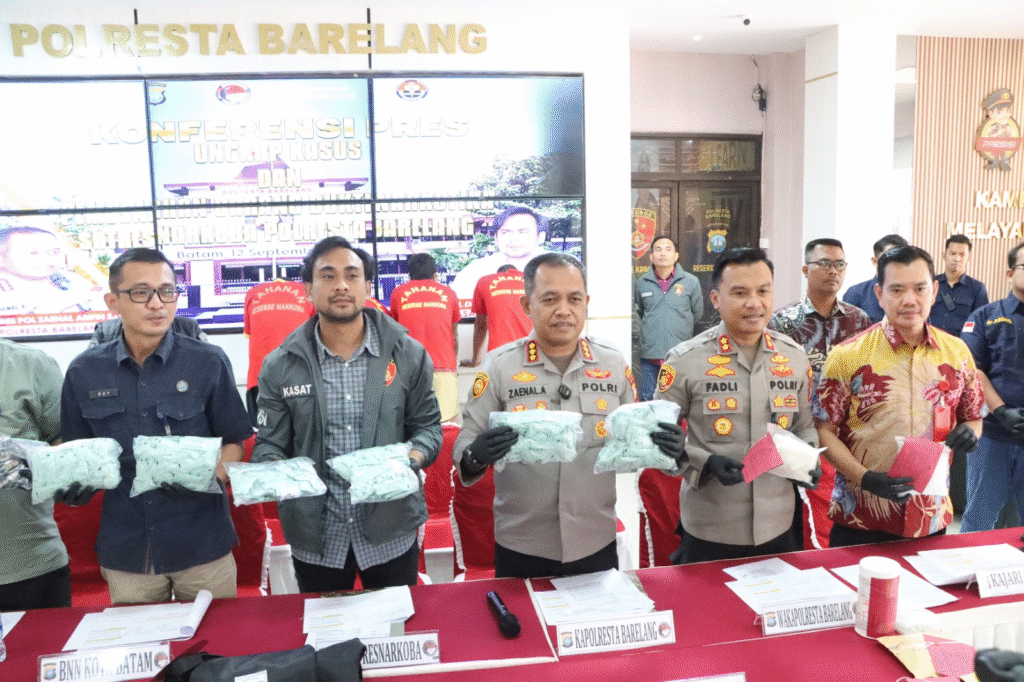 Polresta Barelang, pilarpos.info – Polresta Barelang melaksanakan konferensi pers terkait pemusnahan barang bukti narkotika serta pengungkapan kasus tindak pidana peredaran obat ilegal. Kegiatan ini dipimpin langsung oleh Kapolresta Barelang, Kombes Pol Zaenal Arifin, S.I.K., didampingi Wakapolresta Barelang AKBP Fadli Agus, S.I.K., M.H., M.M., Kasat Resnarkoba Kompol Deni Langie, S.I.K., M.H., serta Kasihumas Polresta Barelang Iptu Budi Santosa, S.H.. Hadir pula perwakilan dari Kejaksaan Negeri Batam, BNN Kota Batam, BPOM Kota Batam dan Penasehat Hukum. Konferensi pers berlangsung di Lobby Mapolresta Barelang pada Jumat (12/9/2025).