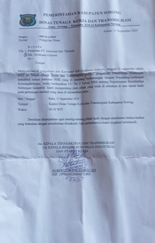 Sorong, pilarpos.info – Karyawan korban PHK PT HIP Senin 15 September 2025 mendatangi Kantor Dinas tenaga kerja dan transmigrasi Kabupaten Sorong, untuk melaporkan pihak perusahaan Perkebunan Sawit PT Henrison Inti Persada yang terletak di km 42 Klamono, terkait PHK yang dilakukan terhadap Gultom, Sinurat dan Fredrik yang adalah karyawan tetap yang bekerja sudah cukup lama bahkan ada yang lebih dari 15 tahun masa kerja.