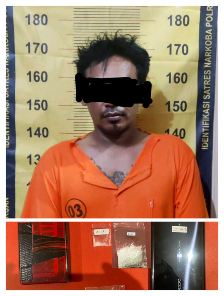 Saat penggeledahan, polisi menemukan satu kantong plastik kecil berisi sabu seberat 0,054 gram, enam plastik klip kosong, sebuah kotak merah-hitam, dan satu unit ponsel Oppo warna hitam.